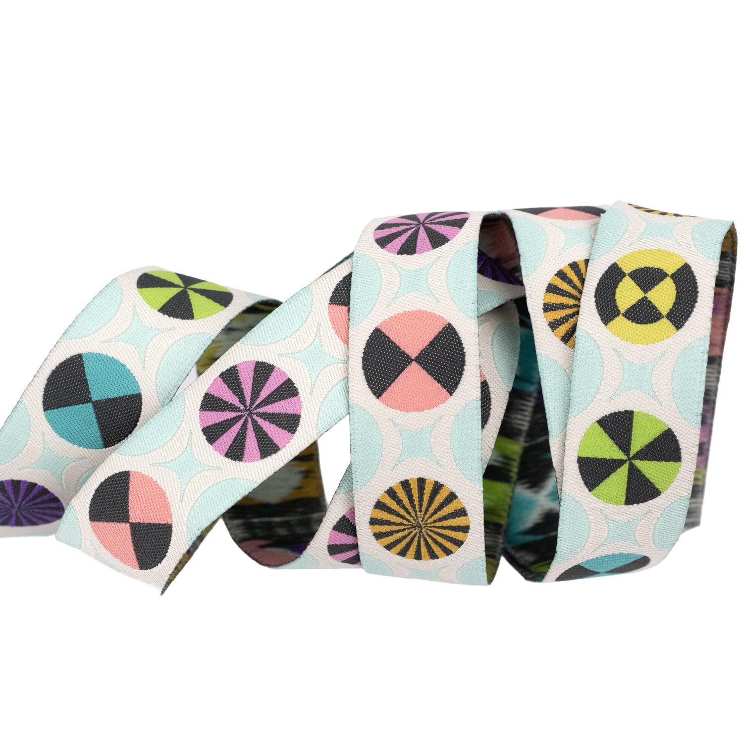 Showcases cheerful multicolor dots scattered across a soft aqua and cream backdrop. Bright, fun, and versatile, this ribbon adds a lively pop of color to trims, bindings, and accessories.
