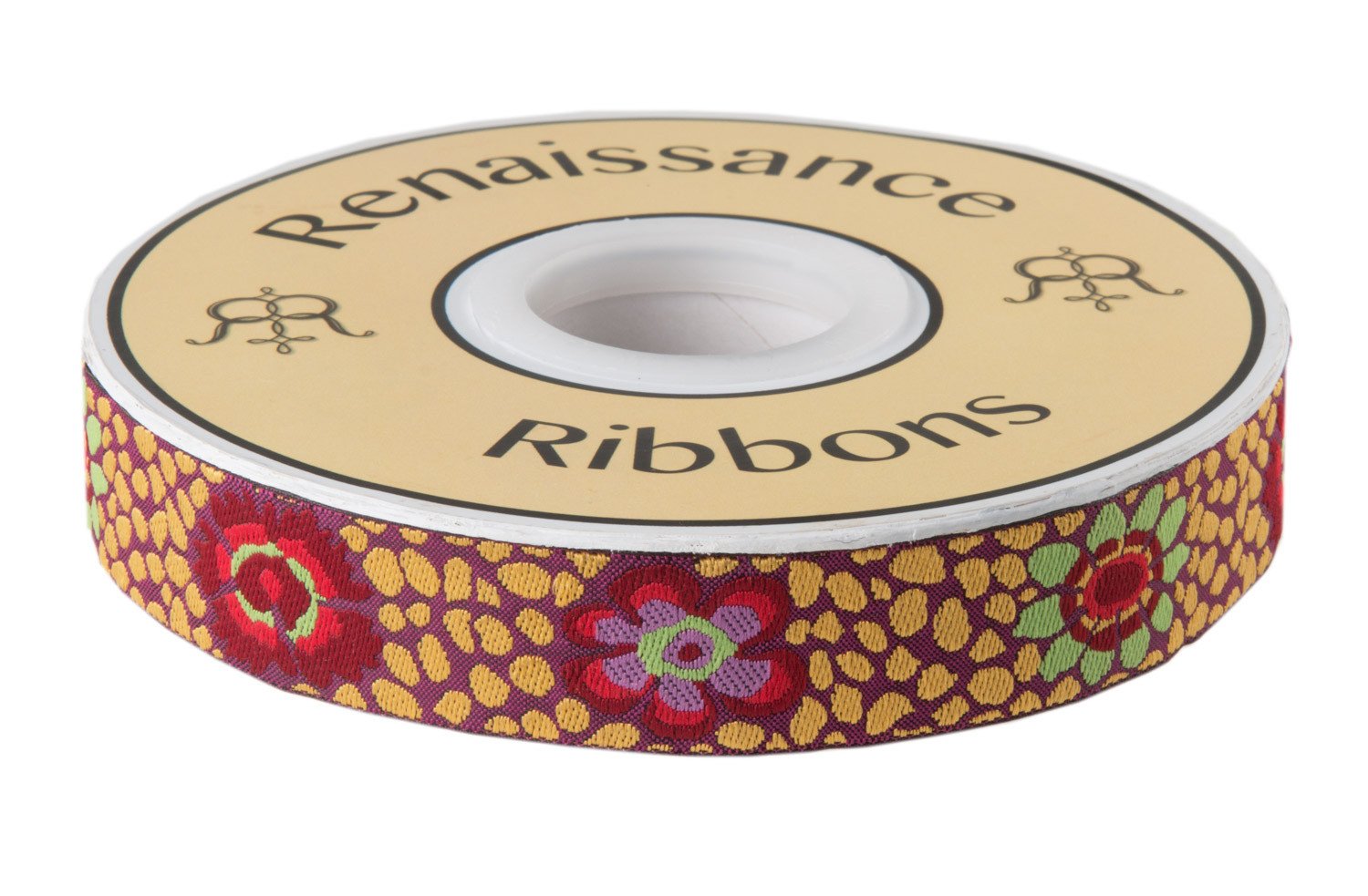 Guinea Flower plum on Gold by Kaffe Fassett 7/8" wide - 27yd spool