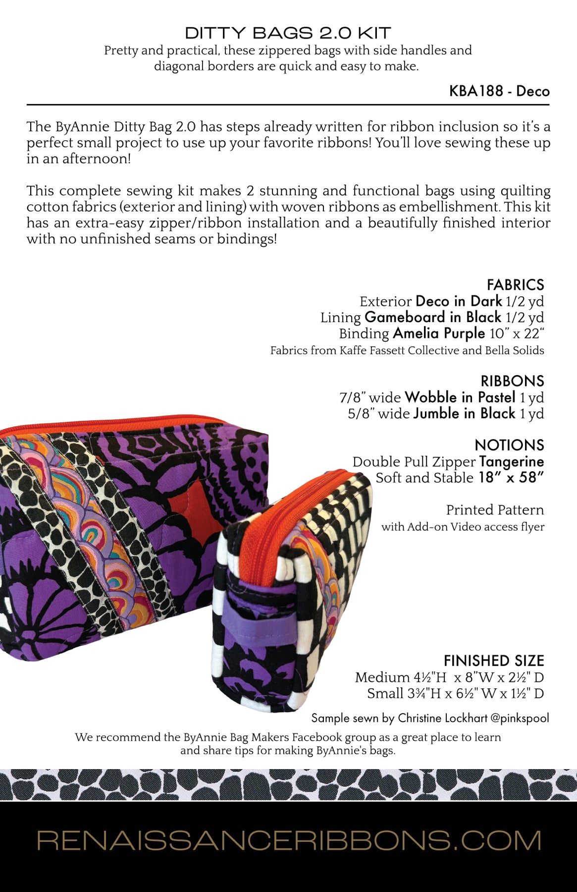 This complete sewing kit makes 2 stunning and functional bags using quilting cotton fabrics (exterior and lining) with woven ribbons as embellishment. This kit has an extra-easy zipper/ribbon installation and a beautifully finished interior with no unfinished seams or bindings!