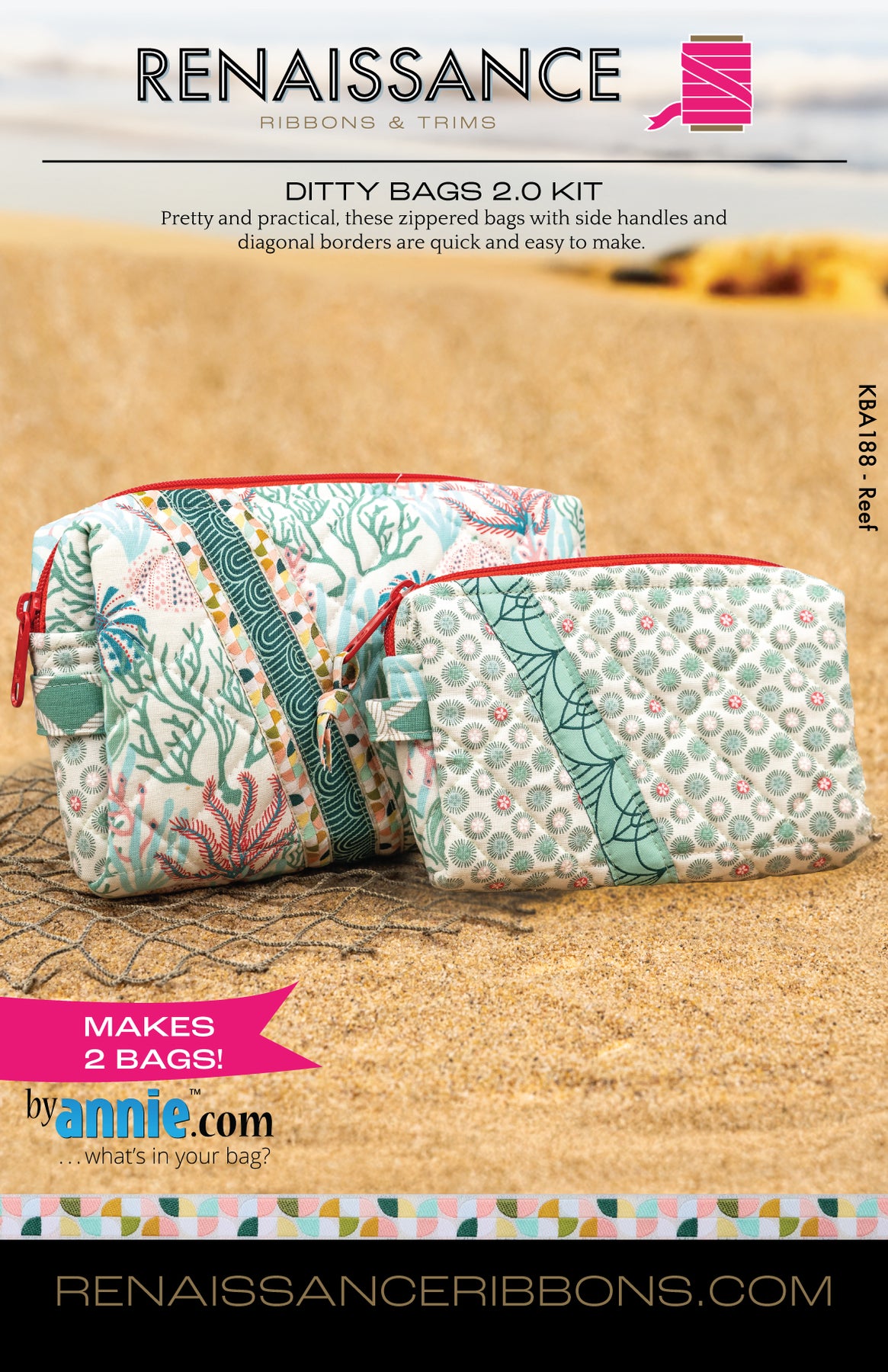 This complete sewing kit makes 2 stunning and functional bags using quilting cotton fabrics (exterior and lining) with woven ribbons as embellishment. This kit has an extra-easy zipper/ribbon installation and a beautifully finished interior with no unfinished seams or bindings!
