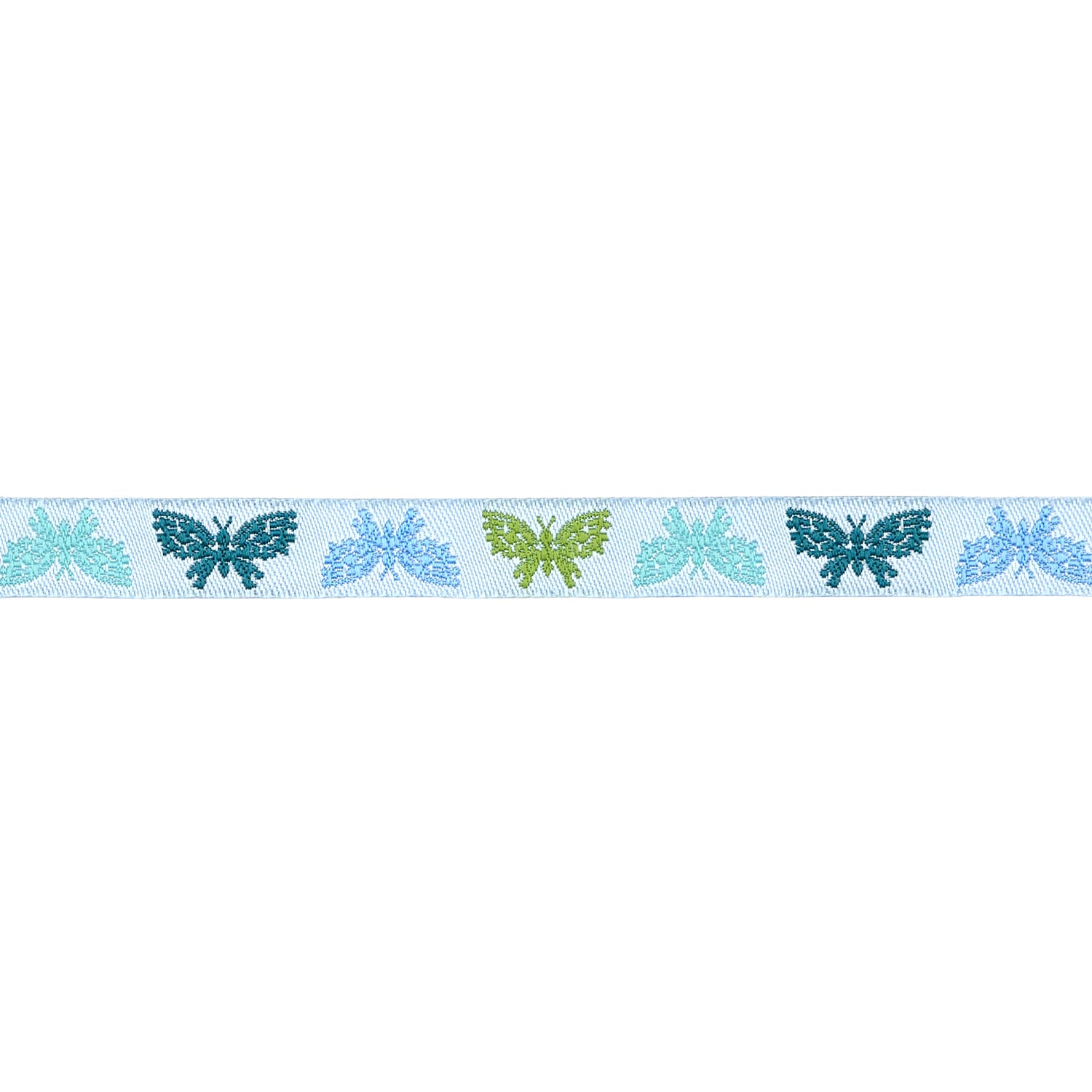 Jewels in flight! Butterfly Blue showcases radiant butterflies in hues of blue, green, and teal against a light blue background. These delicate beauties evoke the sparkle of a rhinestone brooch catching the sunlight.