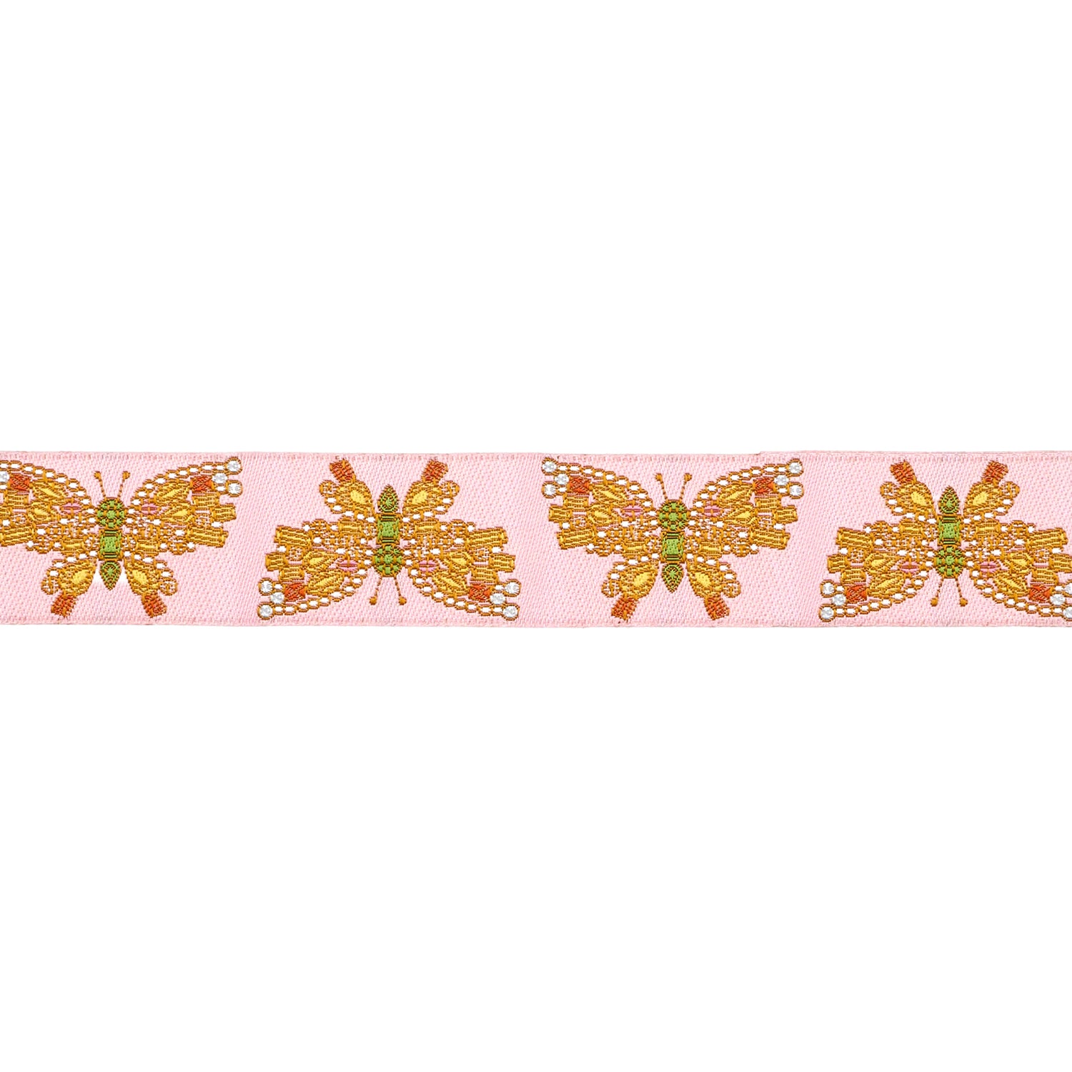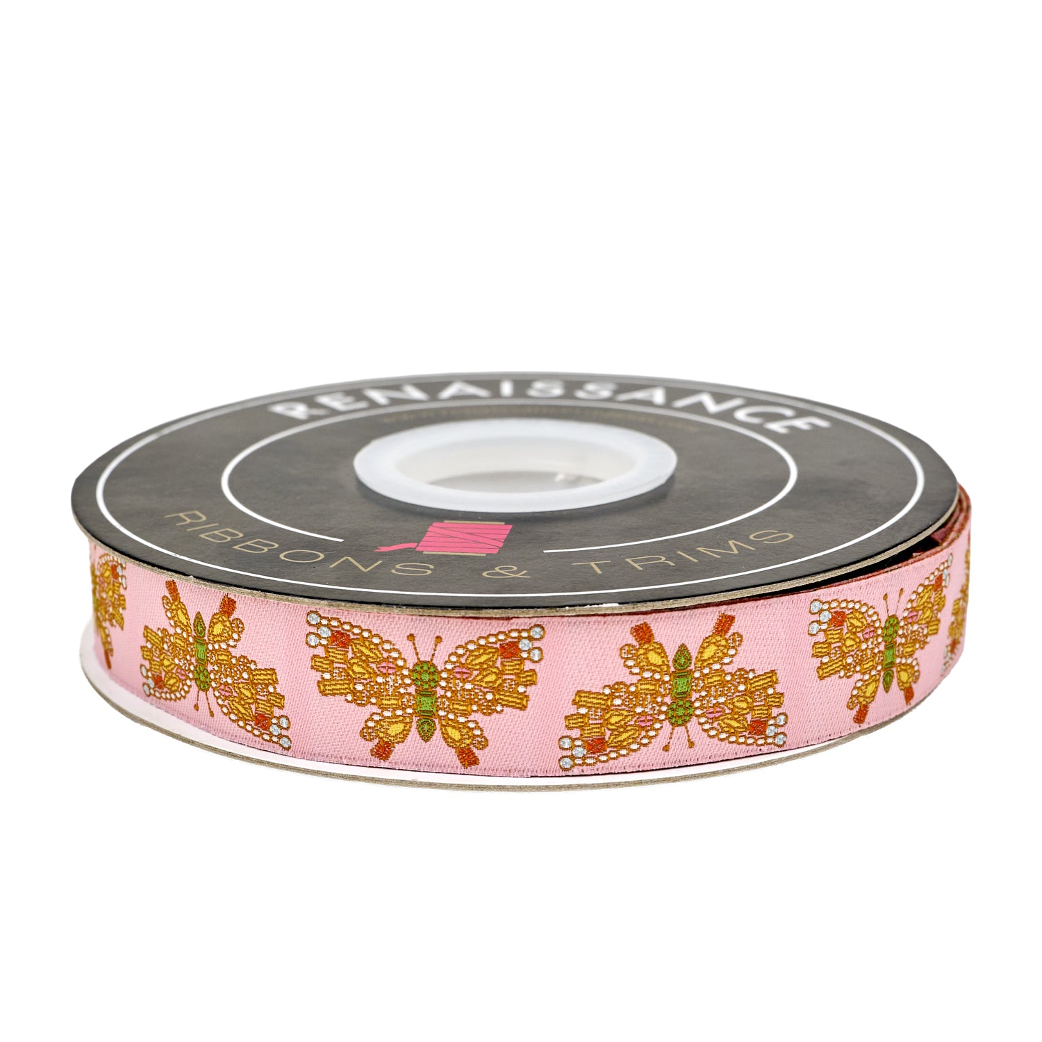Graceful and glamorous, Butterfly Brooch glitters with golden and jeweled butterflies on a pink background. Like a precious heirloom, this ribbon radiates elegance and playful sophistication.