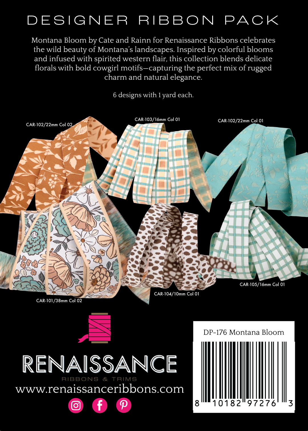 Montana Bloom by Cate and Rainn for Renaissance Ribbons celebrates the wild beauty of Montana’s landscapes. Inspired by colorful blooms and infused with spirited western flair, this collection blends delicate florals with bold cowgirl motifs—capturing the perfect mix of rugged charm and natural elegance.
